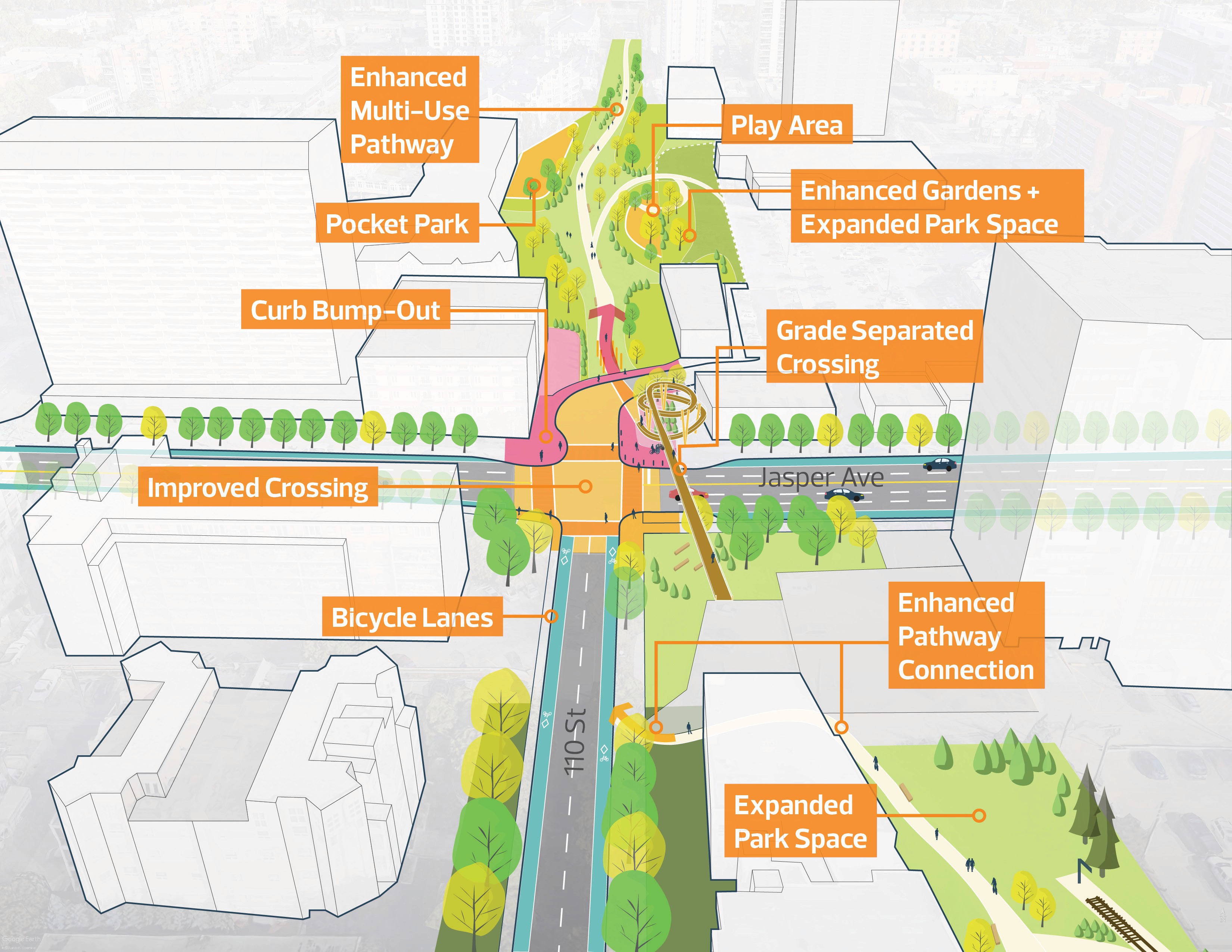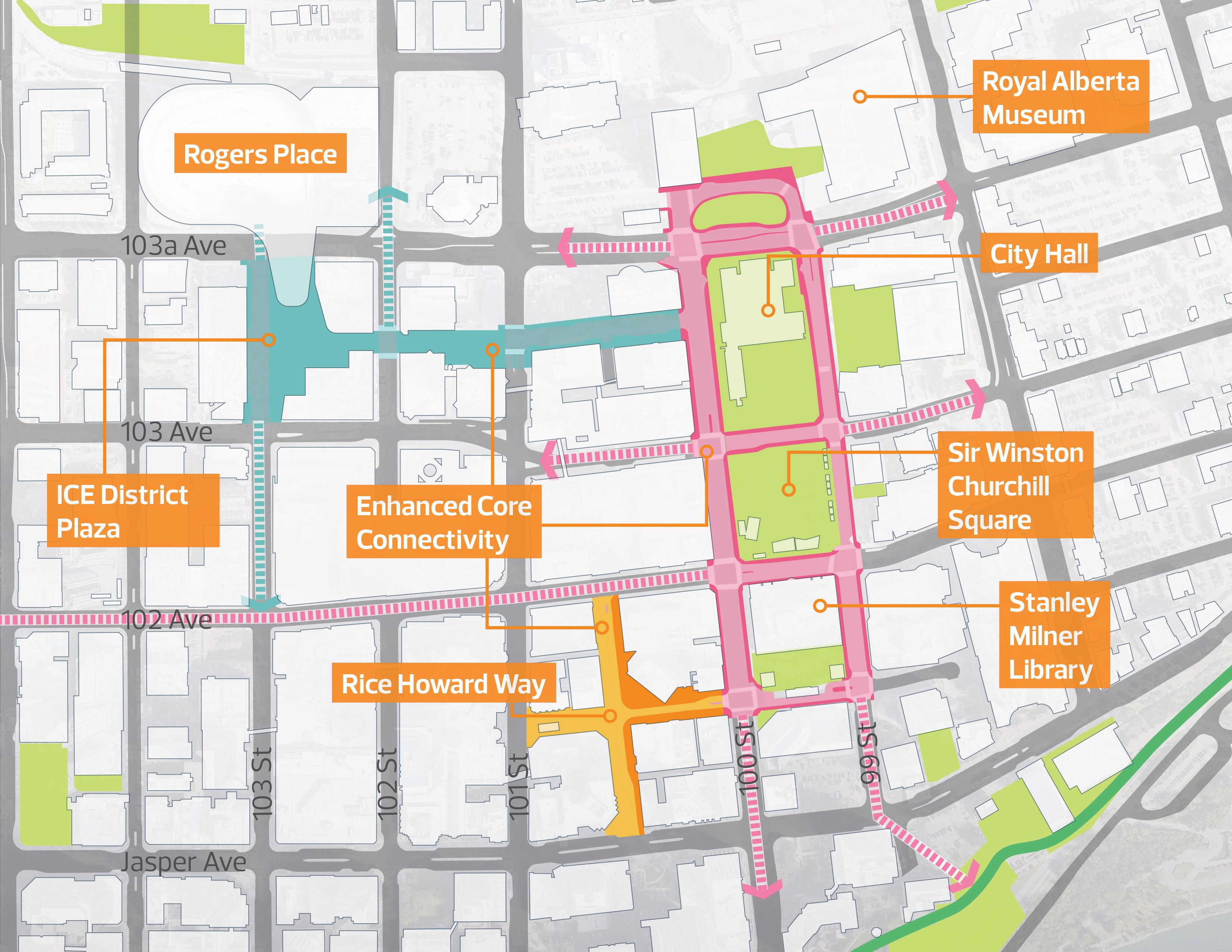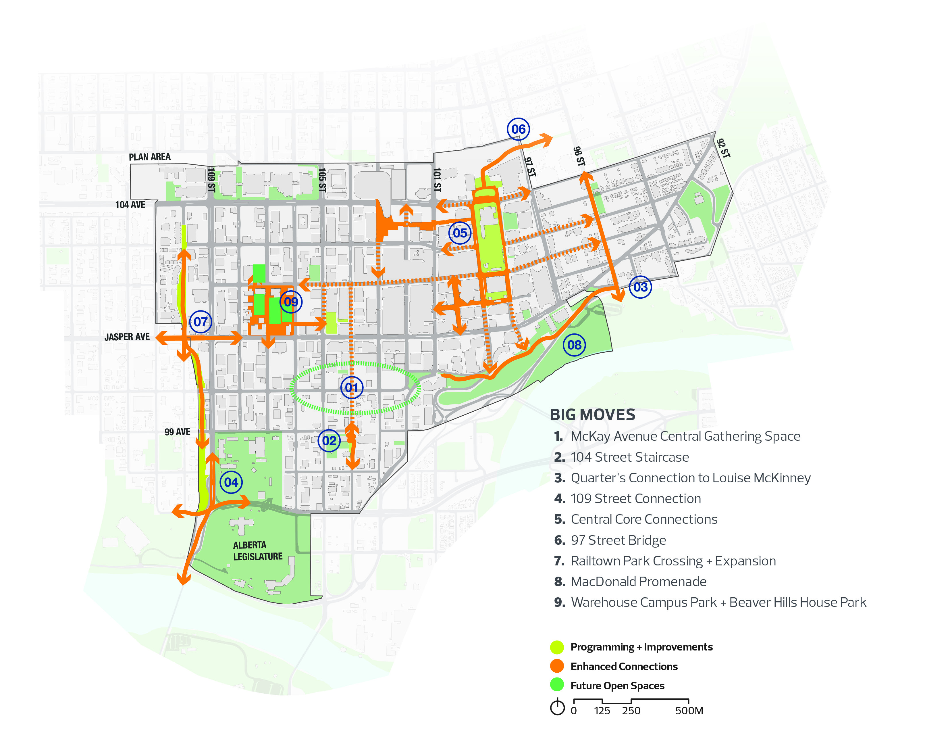 Activity counts were conducted across two distinct seasons to establish baseline metrics for post-development comparison, directly informing both design priorities and operational recommendations. Policy frameworks were developed across a broad range of considerations including safety, social inclusion, equity, micro-climate protection, winter activation, tourism, and mobility. The plan was delivered in close collaboration with City of Edmonton staff and a broad stakeholder group, navigating a complex multi-agency environment to achieve a shared, implementable vision.