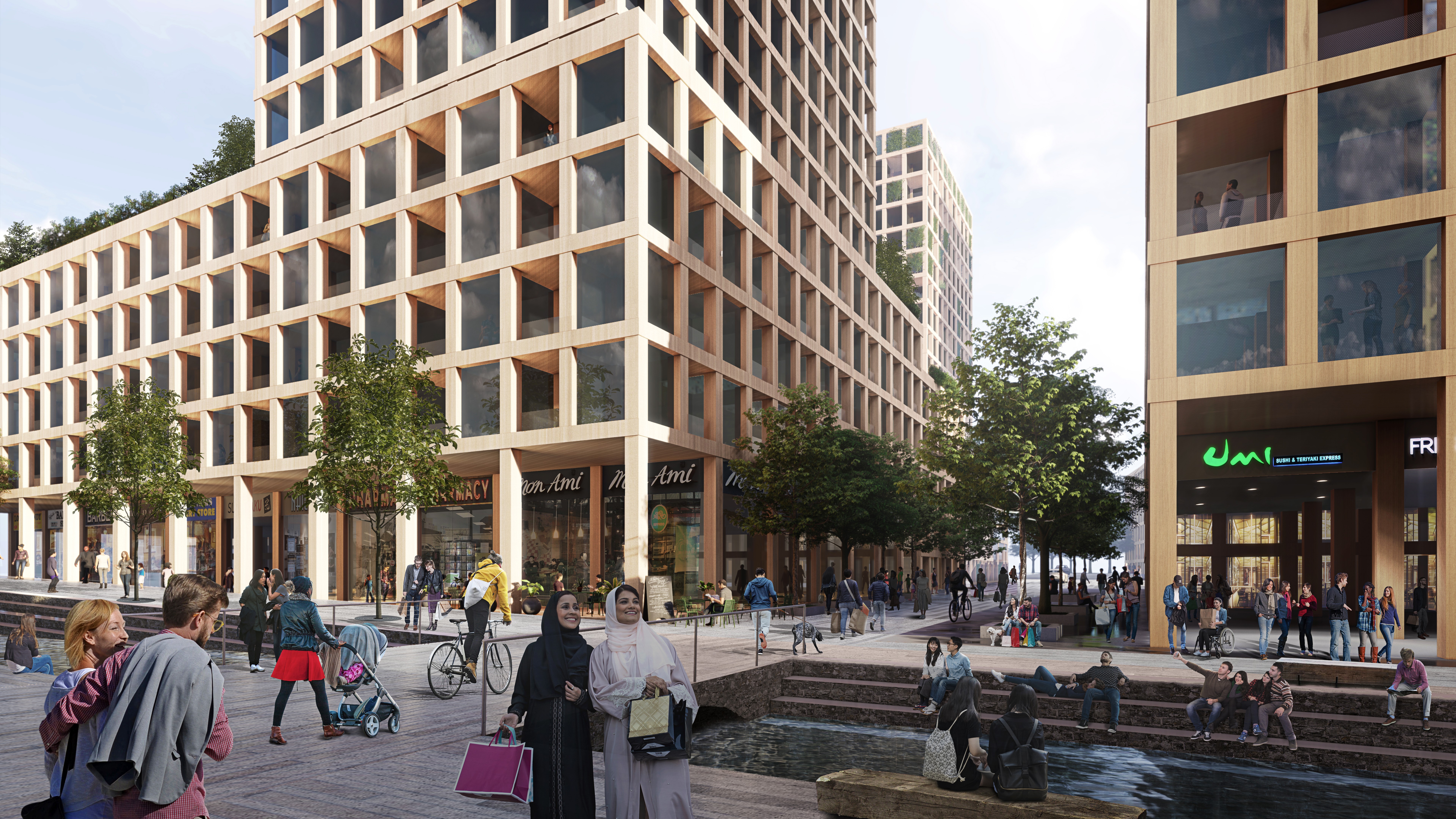 Building LeBreton transforms a vacant brownfield site adjacent to Parliament Hill into a dynamic net zero neighbourhood in Ottawa. LeBreton Flats is designed as a model walkable community where automobiles are filtered to the edges, freeing internal streets for pedestrians. A network of multi-use trails connects residents to the Ottawa River and downtown, with LRT stations, the main street, and parks all accessible without crossing vehicle lanes. The target modal split is 60% transit, 20% walking and cycling, and less than 20% by automobile.